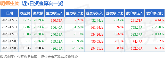 证券之星消息,截至2025年12月12日收盘,明德生物(002932)报收于17.75元,下跌0.39%,换手率2.46%,成交量3.83万手,成交额6806.27万元。