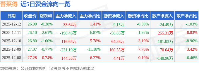 证券之星消息,截至2025年12月12日收盘,普莱得(301353)报收于26.0元,下跌0.38%,换手率2.84%,成交量9052.0手,成交额2377.89万元。