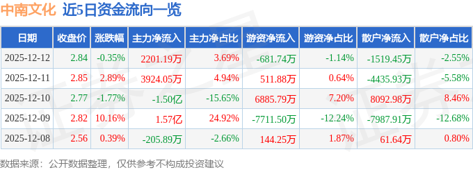 证券之星消息,截至2025年12月12日收盘,中南文化(002445)报收于2.84元,下跌0.35%,换手率8.86%,成交量209.77万手,成交额5.96亿元。