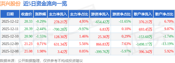 证券之星消息,截至2025年12月12日收盘,洪兴股份(001209)报收于20.33元,下跌0.29%,换手率2.86%,成交量2.75万手,成交额5618.65万元。