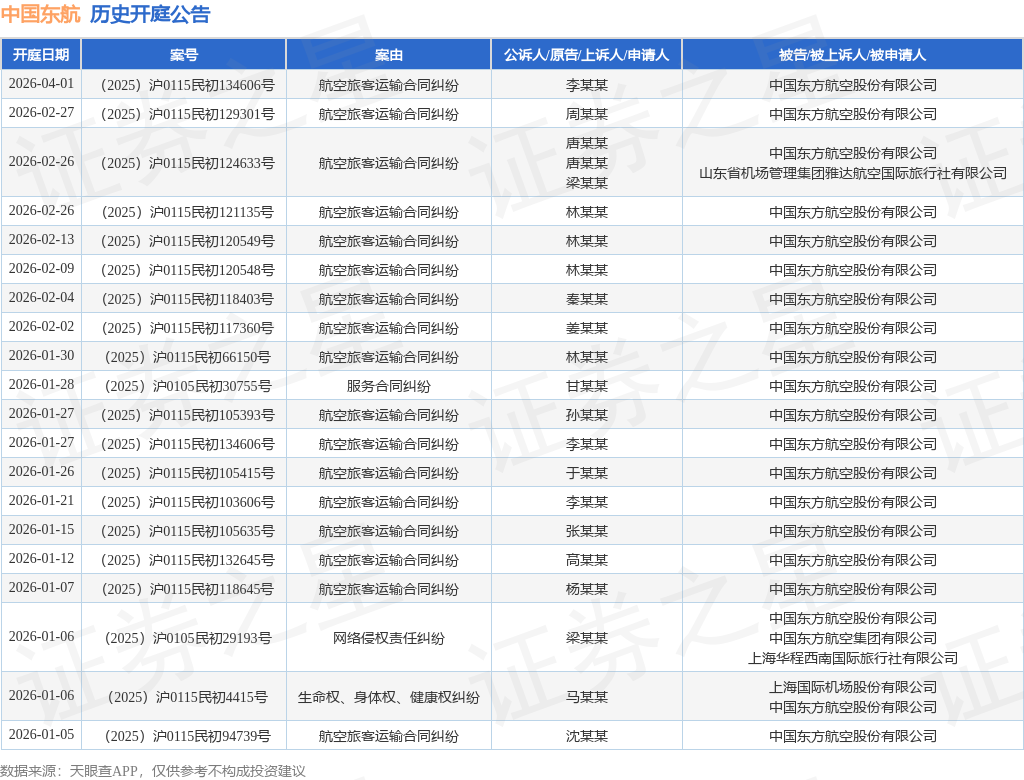 案号:(2025)沪0115民初136041号根据统计,近一年内以中国东方航空股份有限公司为当事人的历史开庭公告有211则,其中案由为“航空旅客运输合同纠纷”的公告以115则居首,其次为“不当得利纠纷”有45则,“生命权、身体权、健康权纠纷”有8则。历史开庭公告(前20条)如下:
