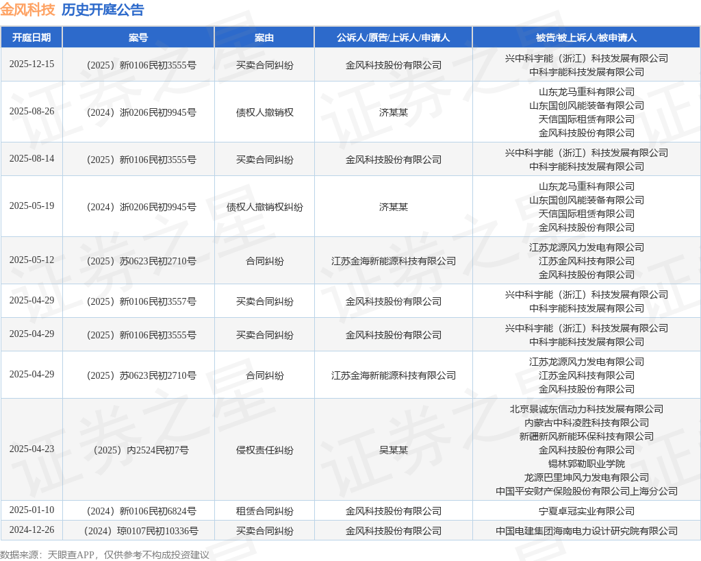 根据统计,近一年内以金风科技股份有限公司为当事人的历史开庭公告有11则,其中案由为“买卖合同纠纷”的公告以5则居首,其次为“合同纠纷”有2则,“侵权责任纠纷”有1则。历史开庭公告如下: