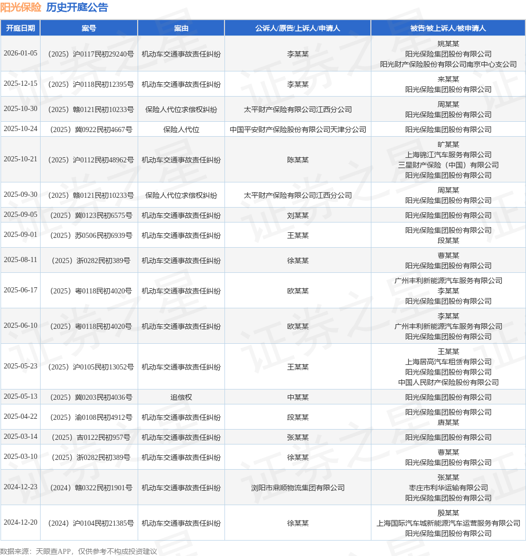 案号:(2025)沪0118民初12395号根据统计,近一年内以阳光保险集团股份有限公司为当事人的历史开庭公告有18则,其中案由为“机动车交通事故责任纠纷”的公告以14则居首,其次为“保险人代位求偿权纠纷”有2则,“保险人代位”有1则。历史开庭公告如下: