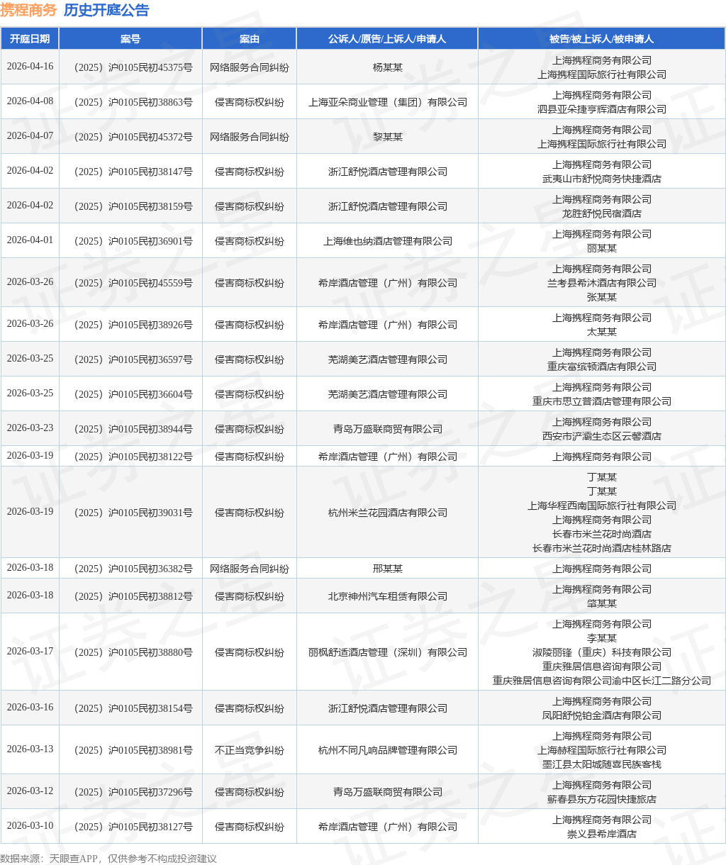 案号:(2025)沪0105民初36544号根据统计,近一年内以上海携程商务有限公司为当事人的历史开庭公告有545则,其中案由为“网络服务合同纠纷”的公告以362则居首,其次为“侵害商标权纠纷”有79则,“服务合同纠纷”有18则。历史开庭公告(前20条)如下: