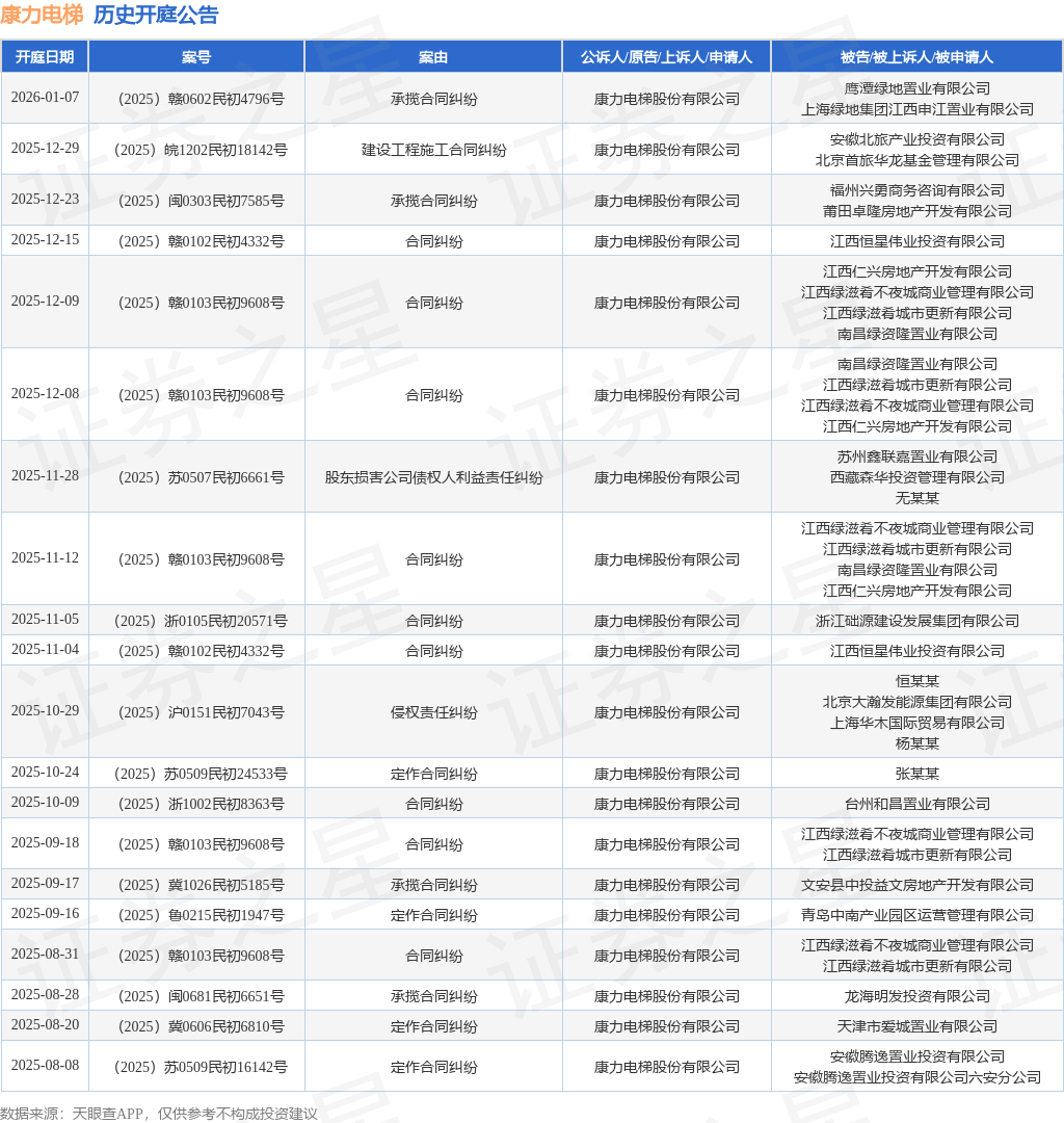 案号:(2025)赣0102民初4332号根据统计,近一年内以康力电梯股份有限公司为当事人的历史开庭公告有162则,其中案由为“定作合同纠纷”的公告以65则居首,其次为“承揽合同纠纷”有28则,“买卖合同纠纷”有27则。历史开庭公告(前20条)如下: