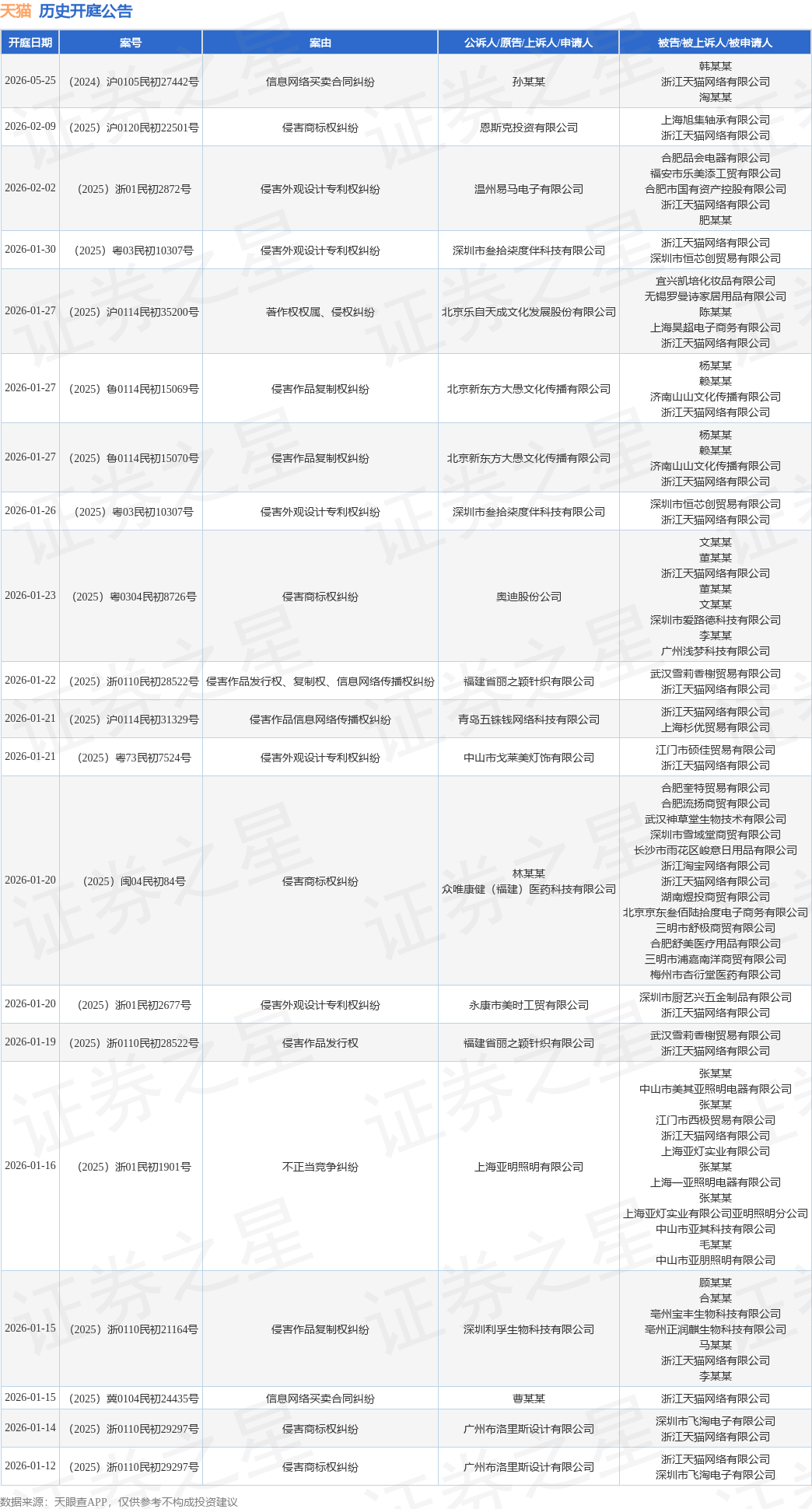 案号:(2025)沪0107民初19383号根据统计,近一年内以浙江天猫网络有限公司为当事人的历史开庭公告有2112则,其中案由为“著作权权属、侵权纠纷”的公告以473则居首,其次为“侵害商标权纠纷”有331则,“侵害外观设计专利权纠纷”有324则。历史开庭公告(前20条)如下:
