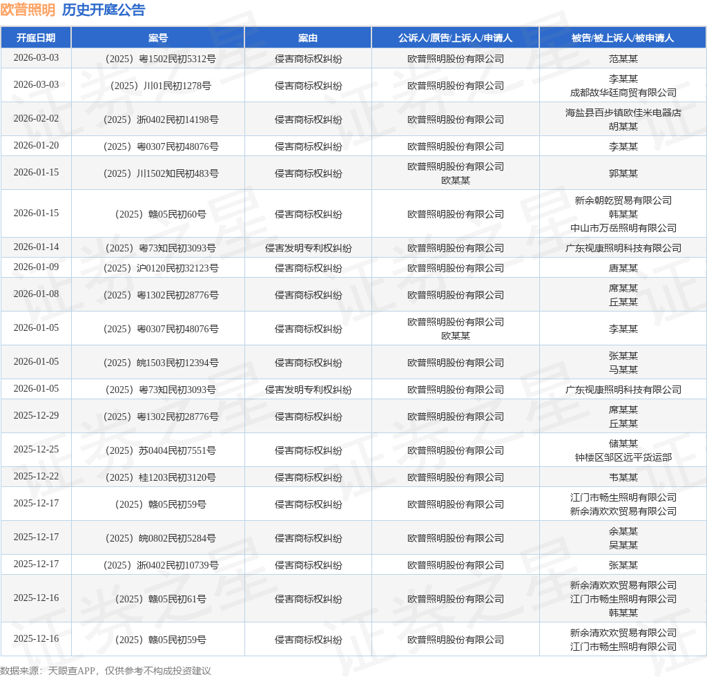 案号:(2025)沪0112民初45763号根据统计,近一年内以欧普照明股份有限公司为当事人的历史开庭公告有549则,其中案由为“侵害商标权纠纷”的公告以464则居首,其次为“侵害商标权”有24则,“商标权权属、侵权纠纷”有16则。历史开庭公告(前20条)如下: