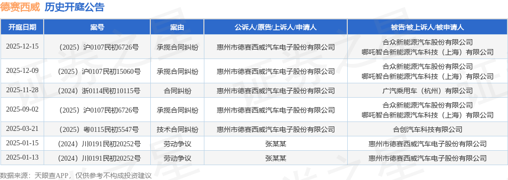 案号:(2025)沪0107民初6726号根据统计,近一年内以惠州市德赛西威汽车电子股份有限公司为当事人的历史开庭公告有7则,其中案由为“承揽合同纠纷”的公告以3则居首,其次为“劳动争议”有2则,“合同纠纷”有1则。历史开庭公告如下: