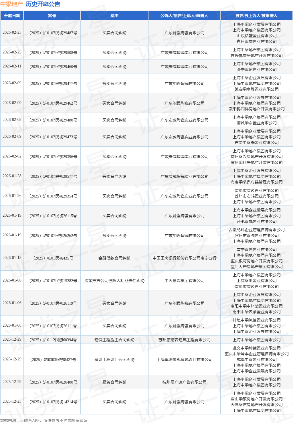 案号:(2025)云01民初370号根据统计,近一年内以上海中梁地产集团有限公司为当事人的历史开庭公告有163则,其中案由为“商品房预售合同纠纷”的公告以73则居首,其次为“买卖合同纠纷”有27则,“建设工程施工合同纠纷”有17则。历史开庭公告(前20条)如下: