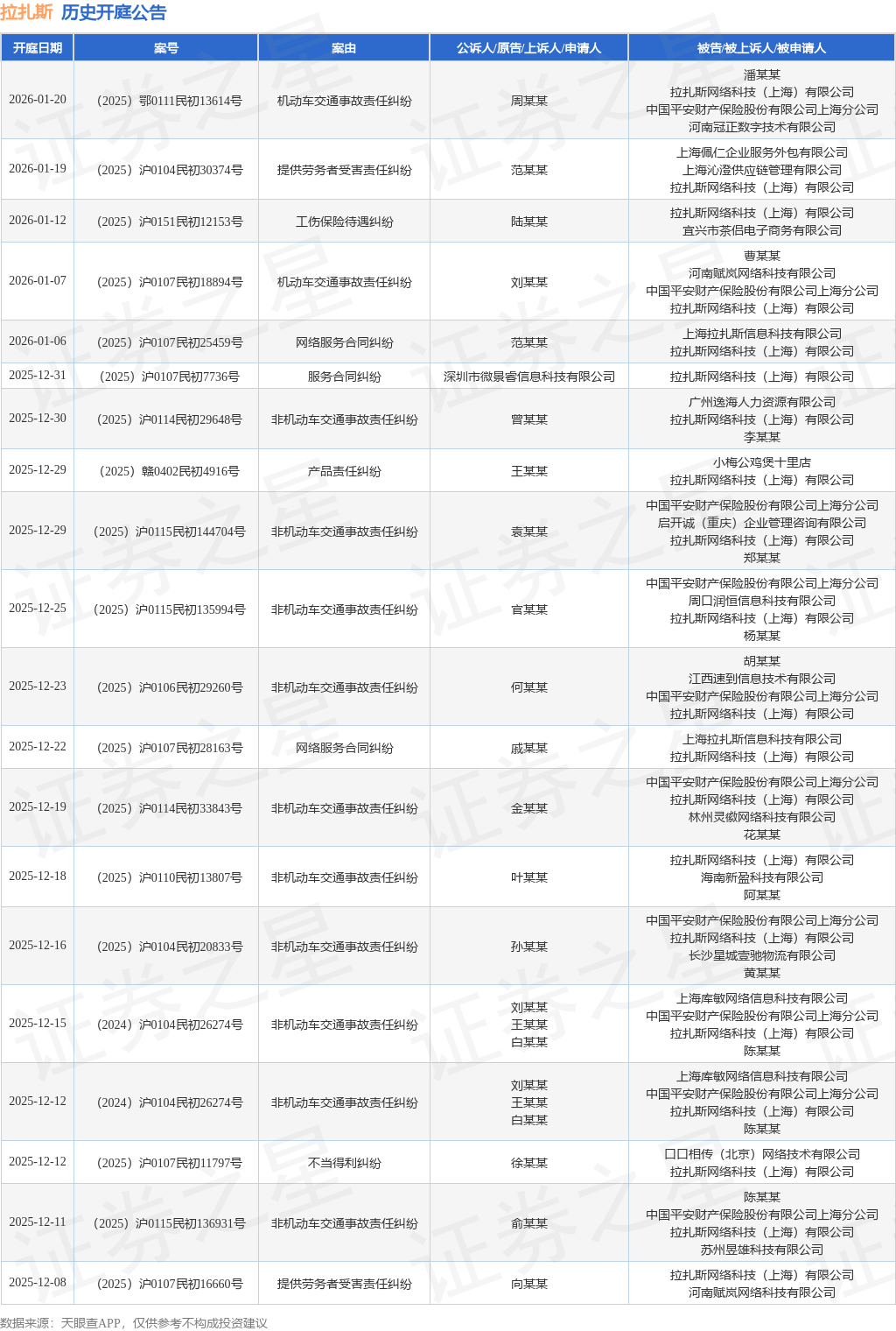 案号:(2024)沪0104民初26274号根据统计,近一年内以拉扎斯网络科技(上海)有限公司为当事人的历史开庭公告有207则,其中案由为“非机动车交通事故责任纠纷”的公告以93则居首,其次为“劳动争议”有24则,“机动车交通事故责任纠纷”有21则。历史开庭公告(前20条)如下: