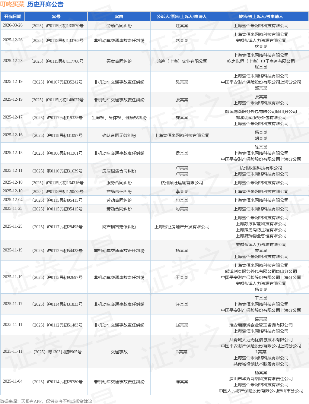 案号:(2025)沪0106民初41361号根据统计,近一年内以上海壹佰米网络科技有限公司为当事人的历史开庭公告有144则,其中案由为“非机动车交通事故责任纠纷”的公告以48则居首,其次为“劳动争议”有36则,“房屋租赁合同纠纷”有12则。历史开庭公告(前20条)如下: