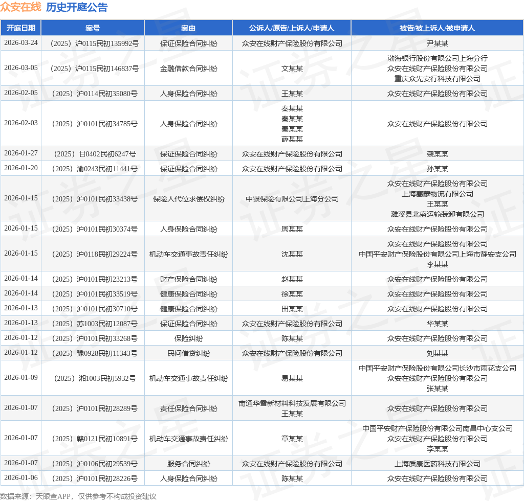 案号:(2025)沪0101民初28299号根据统计,近一年内以众安在线财产保险股份有限公司为当事人的历史开庭公告有4583则,其中案由为“保证保险合同纠纷”的公告以2965则居首,其次为“人身保险合同纠纷”有628则,“保险人代位求偿权纠纷”有288则。历史开庭公告(前20条)如下: