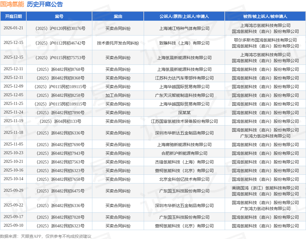 案号:(2025)沪0112民初46742号根据统计,近一年内以国鸿氢能科技(嘉兴)股份有限公司为当事人的历史开庭公告有37则,其中案由为“买卖合同纠纷”的公告以32则居首,其次为“劳动争议”有2则,“加工合同纠纷”有1则。历史开庭公告(前20条)如下: