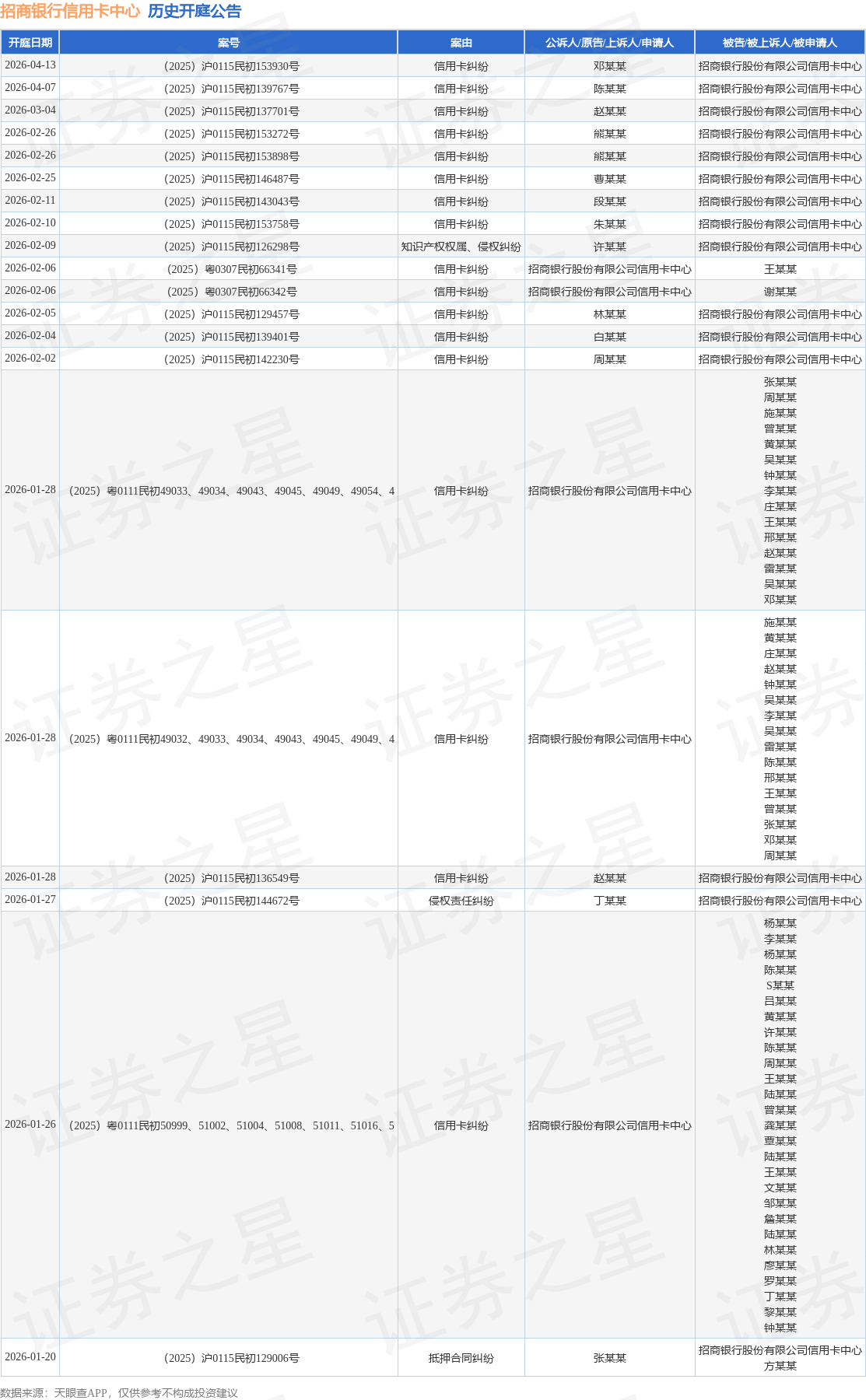 案号:(2025)赣0902民初12939号根据统计,近一年内以招商银行股份有限公司信用卡中心为当事人的历史开庭公告有12423则,其中案由为“信用卡纠纷”的公告以9929则居首,其次为“金融借款合同纠纷”有2377则,“小额借款合同纠纷”有30则。历史开庭公告(前20条)如下: