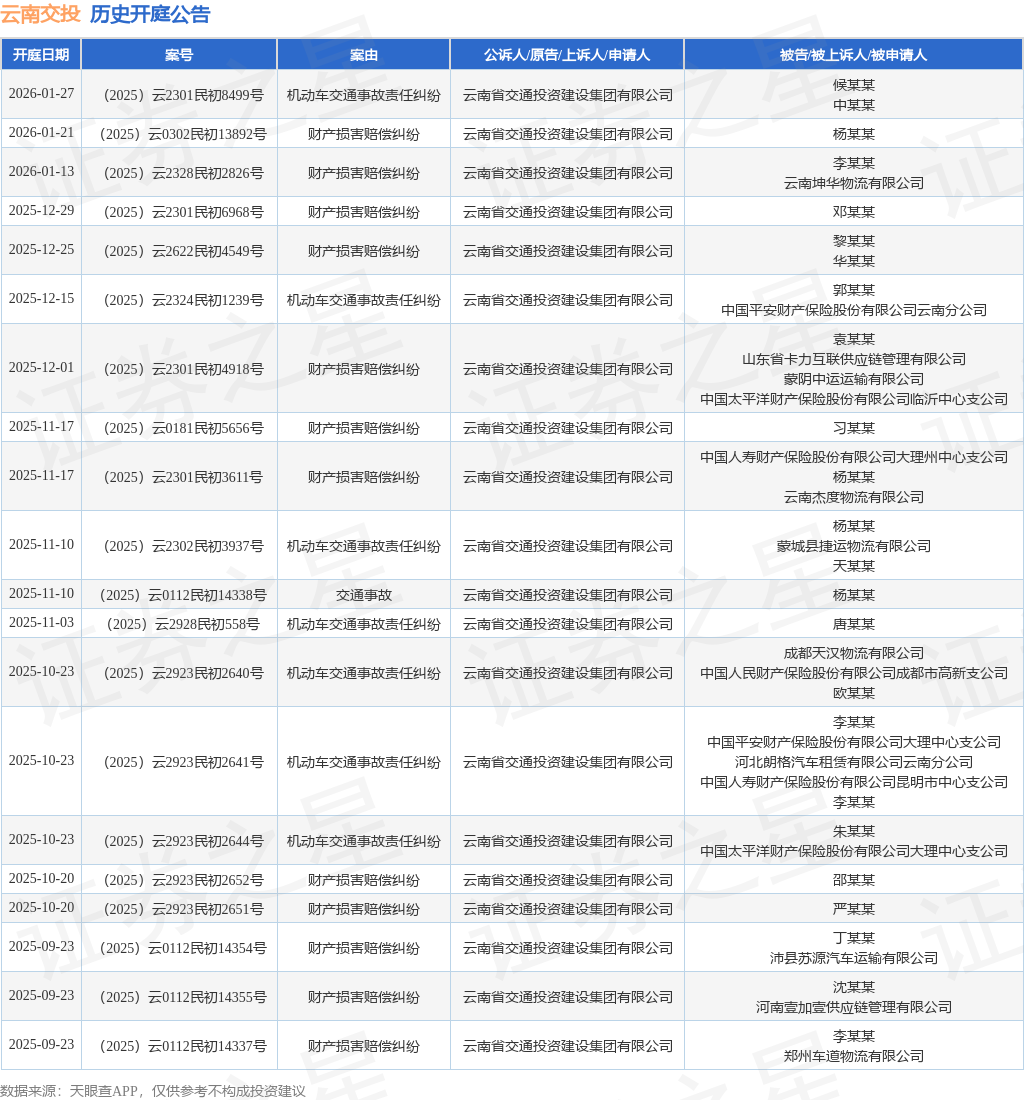 案号:(2025)云2324民初1239号根据统计,近一年内以云南省交通投资建设集团有限公司为当事人的历史开庭公告有82则,其中案由为“财产损害赔偿纠纷”的公告以40则居首,其次为“机动车交通事故责任纠纷”有36则,“建设工程分包合同纠纷”有2则。历史开庭公告(前20条)如下: