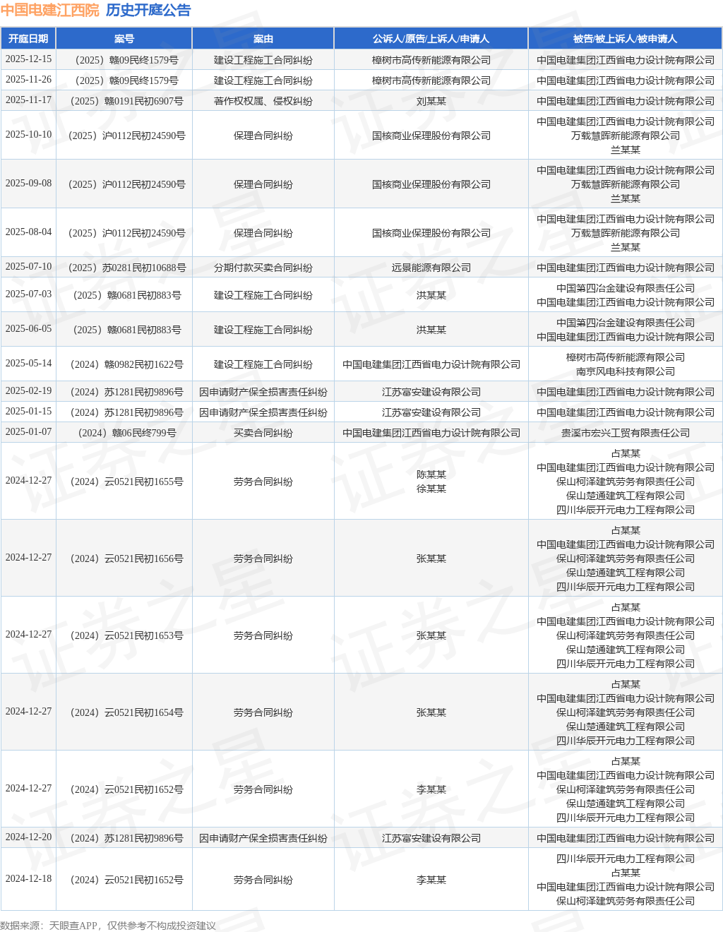 案号:(2025)赣09民终1579号根据统计,近一年内以中国电建集团江西省电力设计院有限公司为当事人的历史开庭公告有29则,其中案由为“劳务合同纠纷”的公告以15则居首,其次为“建设工程施工合同纠纷”有5则,“保理合同纠纷”有3则。历史开庭公告(前20条)如下: