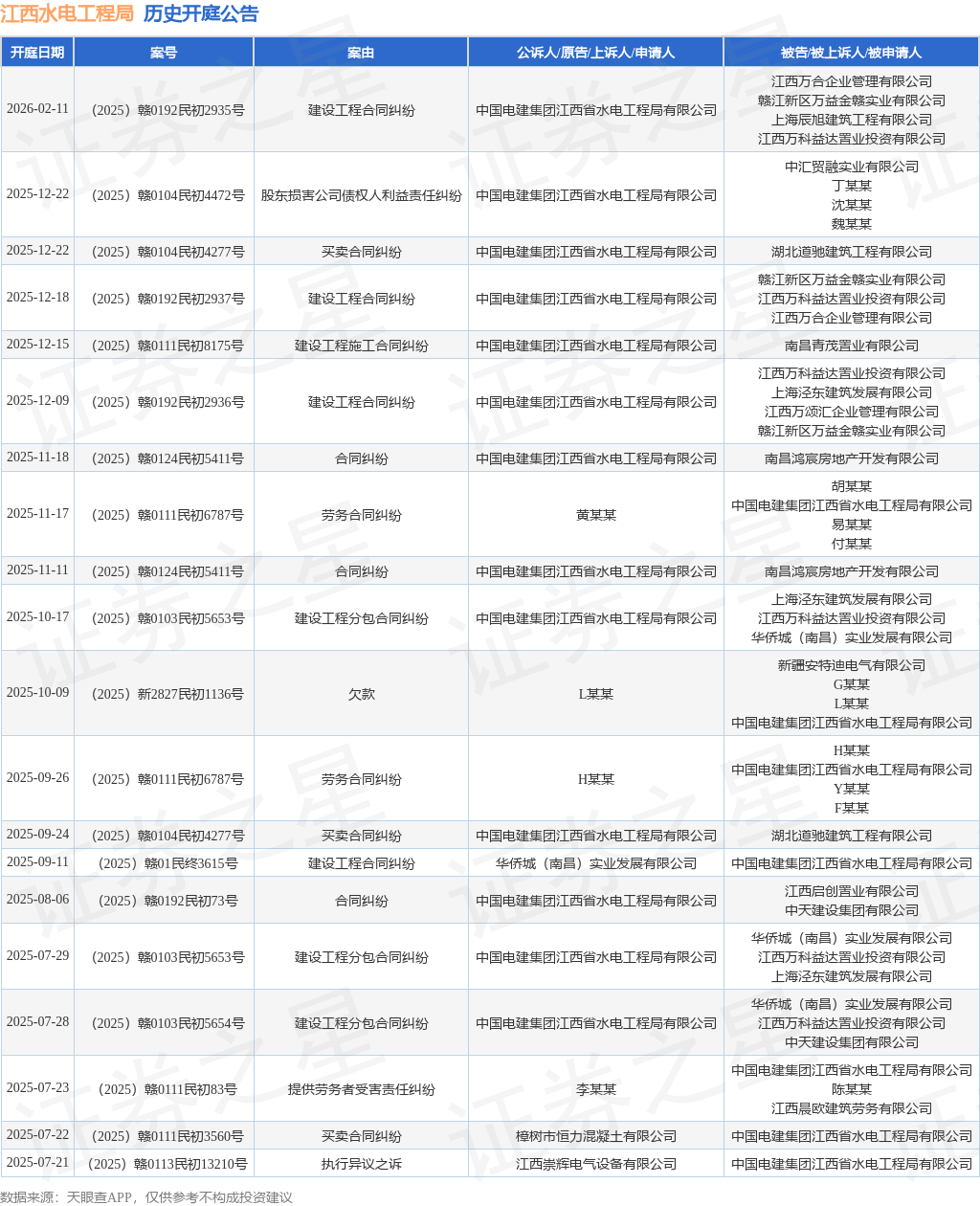 案号:(2025)赣0111民初8175号根据统计,近一年内以中国电建集团江西省水电工程局有限公司为当事人的历史开庭公告有74则,其中案由为“买卖合同纠纷”的公告以12则居首,其次为“建设工程合同纠纷”有11则,“建设工程分包合同纠纷”有10则。历史开庭公告(前20条)如下:
