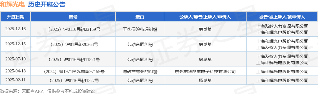 案号:(2025)沪01民终20263号根据统计,近一年内以上海和辉光电股份有限公司为当事人的历史开庭公告有5则,其中案由为“劳动合同纠纷”的公告以3则居首,其次为“与破产有关的纠纷”有1则,“工伤保险待遇纠纷”有1则。历史开庭公告如下: