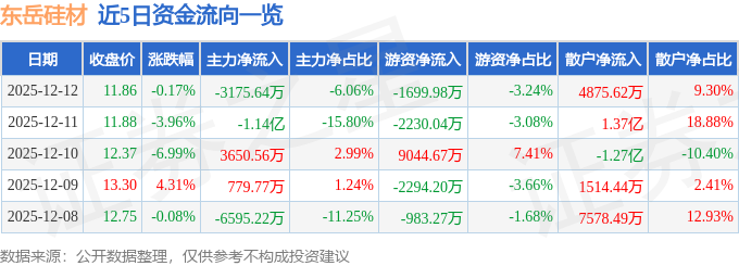 证券之星消息,截至2025年12月12日收盘,东岳硅材(300821)报收于11.86元,下跌0.17%,换手率3.69%,成交量44.24万手,成交额5.24亿元。