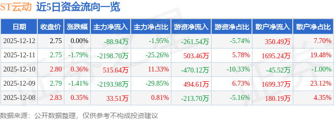 证券之星消息,截至2025年12月12日收盘,ST云动(000903)报收于2.75元,上涨0.0%,换手率0.86%,成交量16.61万手,成交额4553.94万元。