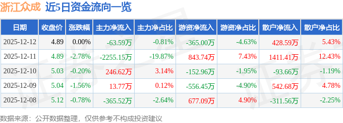 证券之星消息,截至2025年12月12日收盘,浙江众成(002522)报收于4.89元,上涨0.0%,换手率1.77%,成交量16.03万手,成交额7889.27万元。