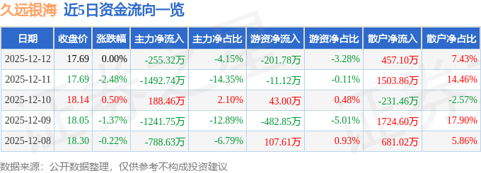 12月12日的资金流向数据方面,主力资金净流出255.32万元,占总成交额4.15%,游资资金净流出201.78万元,占总成交额3.28%,散户资金净流入457.1万元,占总成交额7.43%。