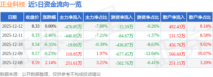 证券之星消息,截至2025年12月12日收盘,正业科技(300410)报收于8.33元,上涨0.0%,换手率1.96%,成交量7.21万手,成交额6051.85万元。