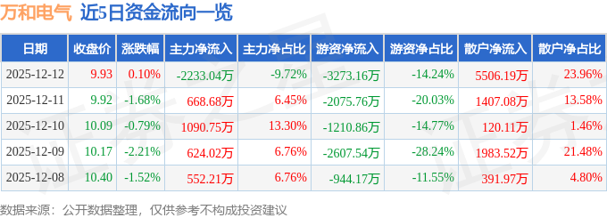证券之星消息,截至2025年12月12日收盘,万和电气(002543)报收于9.93元,上涨0.1%,换手率3.52%,成交量23.28万手,成交额2.3亿元。