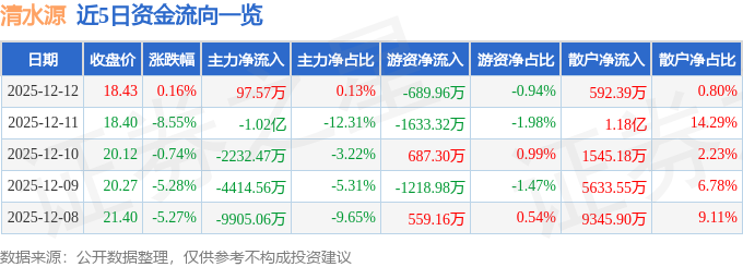 证券之星消息,截至2025年12月12日收盘,清水源(300437)报收于18.43元,上涨0.16%,换手率22.13%,成交量38.9万手,成交额7.37亿元。