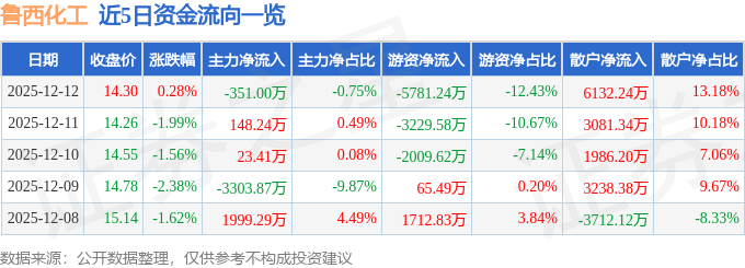 证券之星消息,截至2025年12月12日收盘,鲁西化工(000830)报收于14.3元,上涨0.28%,换手率1.71%,成交量32.59万手,成交额4.65亿元。