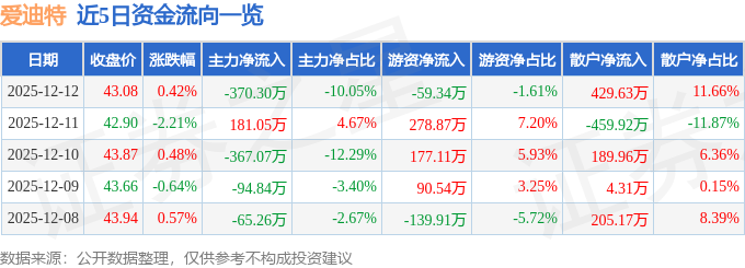 证券之星消息,截至2025年12月12日收盘,爱迪特(301580)报收于43.08元,上涨0.42%,换手率1.19%,成交量8561.0手,成交额3685.73万元。