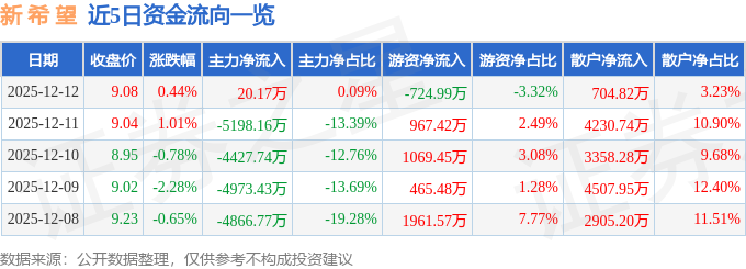 证券之星消息,截至2025年12月12日收盘,新 希 望(000876)报收于9.08元,上涨0.44%,换手率0.54%,成交量24.18万手,成交额2.18亿元。