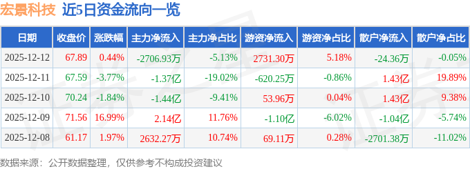 证券之星消息,截至2025年12月12日收盘,宏景科技(301396)报收于67.89元,上涨0.44%,换手率10.28%,成交量7.82万手,成交额5.28亿元。