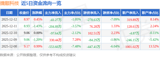 证券之星消息,截至2025年12月12日收盘,捷顺科技(002609)报收于8.97元,上涨0.45%,换手率0.95%,成交量4.38万手,成交额3928.25万元。