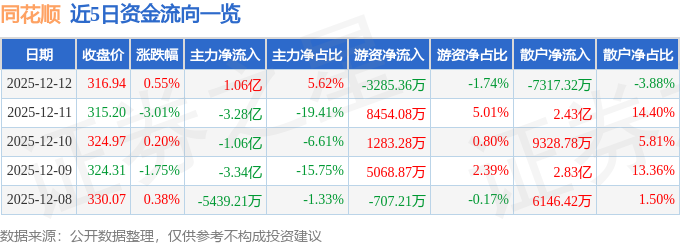 证券之星消息,截至2025年12月12日收盘,同花顺(300033)报收于316.94元,上涨0.55%,换手率2.17%,成交量5.98万手,成交额18.87亿元。