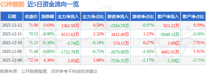证券之星消息,截至2025年12月12日收盘,亿纬锂能(300014)报收于71.0元,上涨0.69%,换手率1.66%,成交量33.39万手,成交额23.6亿元。