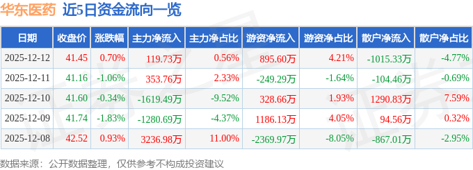 证券之星消息,截至2025年12月12日收盘,华东医药(000963)报收于41.45元,上涨0.7%,换手率0.29%,成交量5.16万手,成交额2.13亿元。