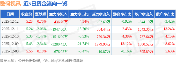 证券之星消息,截至2025年12月12日收盘,数码视讯(300079)报收于5.28元,上涨0.76%,换手率1.49%,成交量19.06万手,成交额1.01亿元。