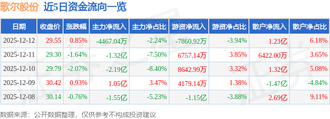 证券之星消息,截至2025年12月12日收盘,歌尔股份(002241)报收于29.55元,上涨0.85%,换手率2.16%,成交量67.9万手,成交额19.94亿元。