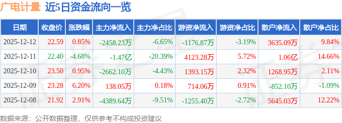 证券之星消息,截至2025年12月12日收盘,广电计量(002967)报收于22.59元,上涨0.85%,换手率2.99%,成交量16.42万手,成交额3.69亿元。