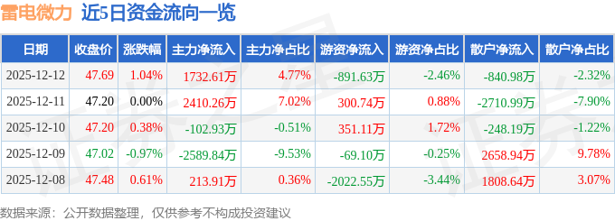 证券之星消息,截至2025年12月12日收盘,雷电微力(301050)报收于47.69元,上涨1.04%,换手率3.62%,成交量7.61万手,成交额3.63亿元。
