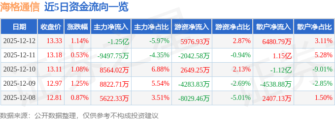证券之星消息,截至2025年12月12日收盘,海格通信(002465)报收于13.33元,上涨1.14%,换手率6.25%,成交量154.94万手,成交额20.85亿元。