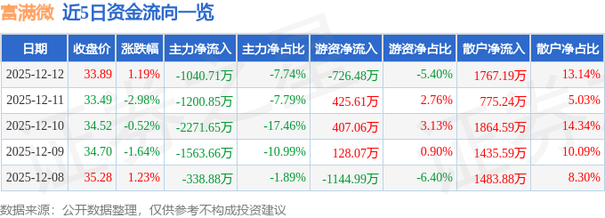 证券之星消息,截至2025年12月12日收盘,富满微(300671)报收于33.89元,上涨1.19%,换手率1.81%,成交量3.99万手,成交额1.34亿元。