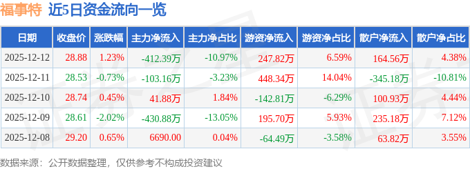 12月12日的资金流向数据方面,主力资金净流出412.39万元,占总成交额10.97%,游资资金净流入247.82万元,占总成交额6.59%,散户资金净流入164.56万元,占总成交额4.38%。