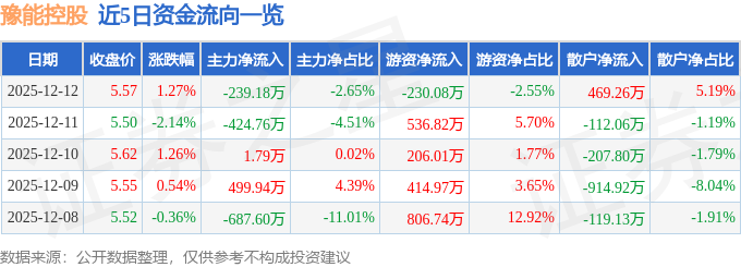 证券之星消息,截至2025年12月12日收盘,豫能控股(001896)报收于5.57元,上涨1.27%,换手率1.06%,成交量16.17万手,成交额9034.38万元。