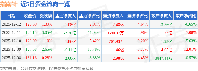 证券之星消息,截至2025年12月12日收盘,指南针(300803)报收于126.89元,上涨1.39%,换手率6.99%,成交量41.82万手,成交额53.49亿元。
