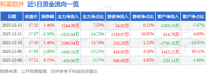 证券之星消息,截至2025年12月12日收盘,科蓝软件(300663)报收于17.32元,上涨1.46%,换手率2.58%,成交量11.73万手,成交额2.05亿元。