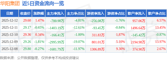 证券之星消息,截至2025年12月12日收盘,华阳集团(002906)报收于29.6元,上涨1.47%,换手率0.94%,成交量4.93万手,成交额1.46亿元。
