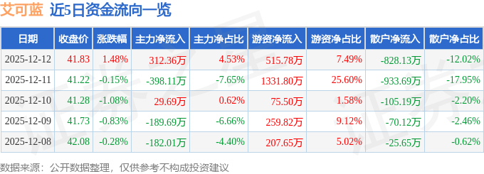 证券之星消息,截至2025年12月12日收盘,艾可蓝(300816)报收于41.83元,上涨1.48%,换手率2.91%,成交量1.65万手,成交额6890.66万元。