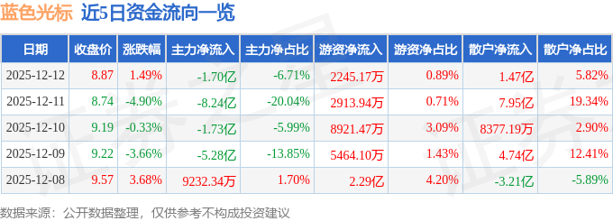 证券之星消息,截至2025年12月12日收盘,蓝色光标(300058)报收于8.87元,上涨1.49%,换手率8.2%,成交量285.48万手,成交额25.29亿元。